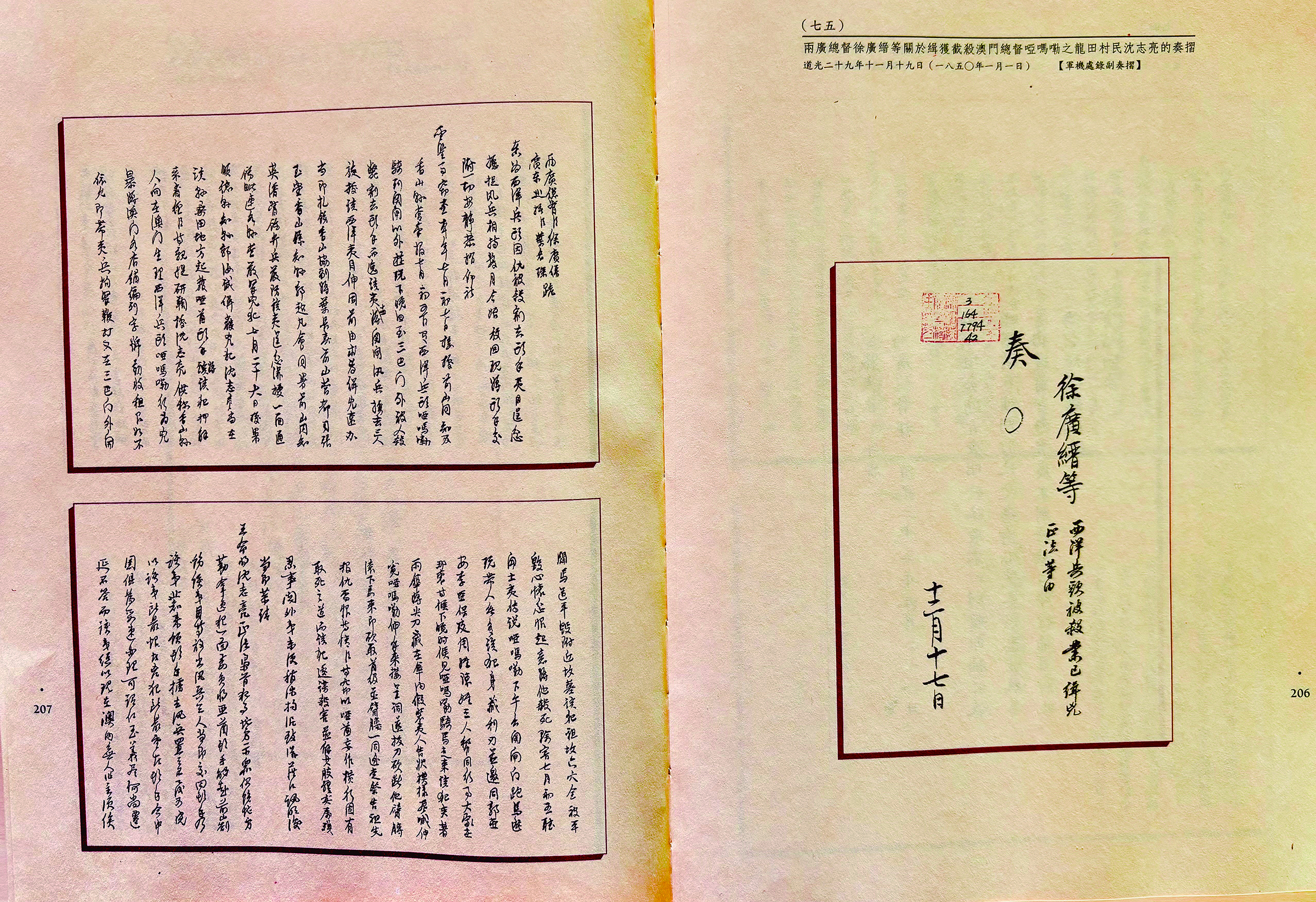 清朝檔案:兩廣總督徐廣縉等關於緝獲截殺澳門總督啞嗎嘞之龍田村民沈志亮的奏摺
