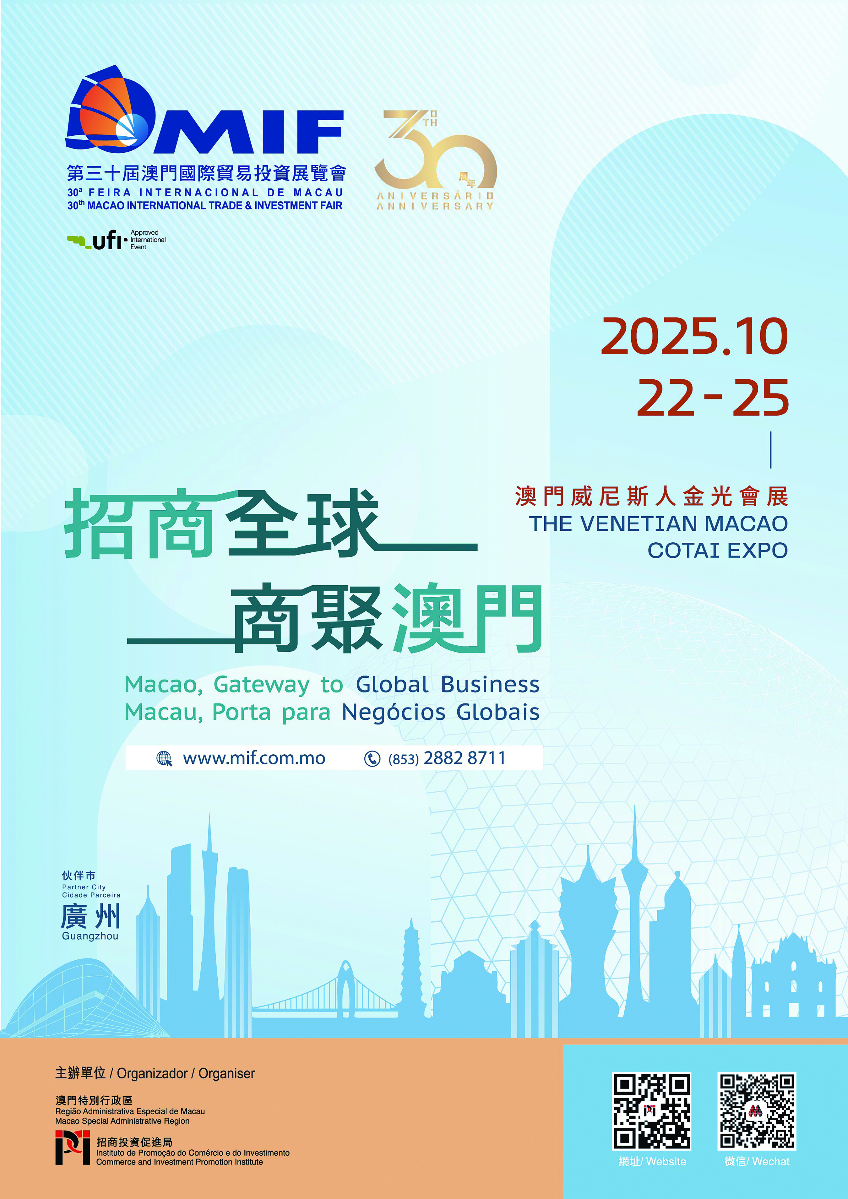 此外,第30屆MIF將與“第二屆中國—葡語國家經貿博覽會(澳門)”、“澳門國際品牌連鎖加盟展2025”及“粵港澳大灣區人才高質量發展大會”同期同場舉行,數展聯動實現資源疊加與效益最大化。如欲了解MIF最新資訊,可瀏覽大會網站:www.mif.com.mo,或致電(853)2882 8711,亦歡迎關注微信號:MICE_IPIM。